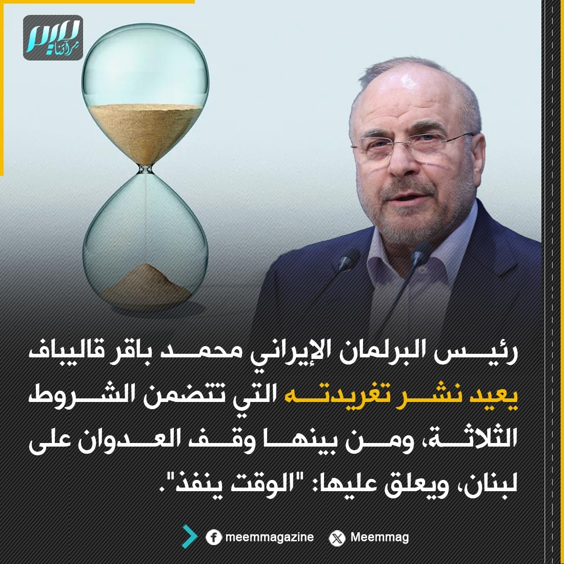 رئيس البرلمان الإيراني محمد باقر قاليباف يعيد نشر تغريدته التي تتضمن الشروط الثلاثة، ومن بينها وقف العدوان على لبنان، ويعلق عليها: "الوقت ينفذ".