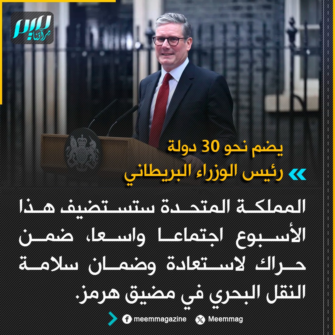رئيس الوزراء البريطاني كير ستارمر: المملكة المتحدة ستستضيف هذا الأسبوع اجتماعاً يضم نحو 30 دولة، ضمن حراك لاستعادة وضمان سلامة النقل البحري في مضيق هرمز.