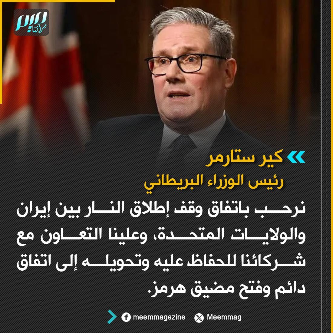 رئيس الوزراء البريطاني: نرحب باتفاق وقف إطلاق النار بين إيران والولايات المتحدة، وعلينا التعاون مع شركائنا للحفاظ عليه وتحويله إلى اتفاق دائم وفتح مضيق هرمز.