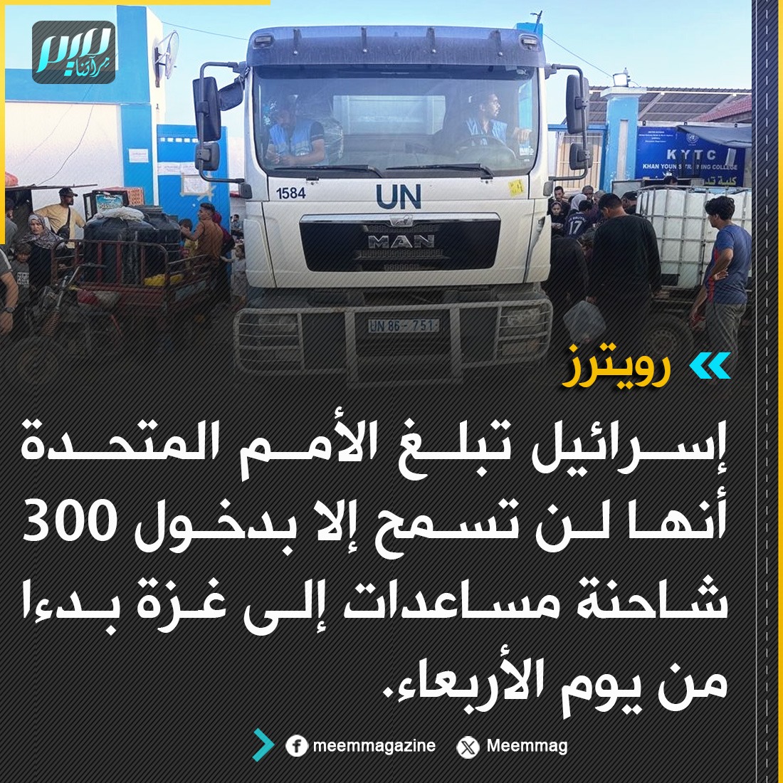 رويترز: إسرائيل تُبلغ الأمم المتحدة أنها لن تسمح إلا بدخول 300 شاحنة مساعدات إلى غزة بدءا من يوم الأربعاء.