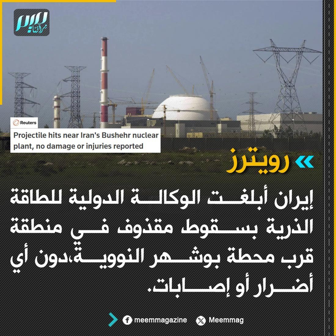 رويترز : إيران أبلغت الوكالة الدولية للطاقة الذرية بسقوط مقذوف في منطقة قرب محطة بوشهر النووية،دون أي أضرار أو إصابات