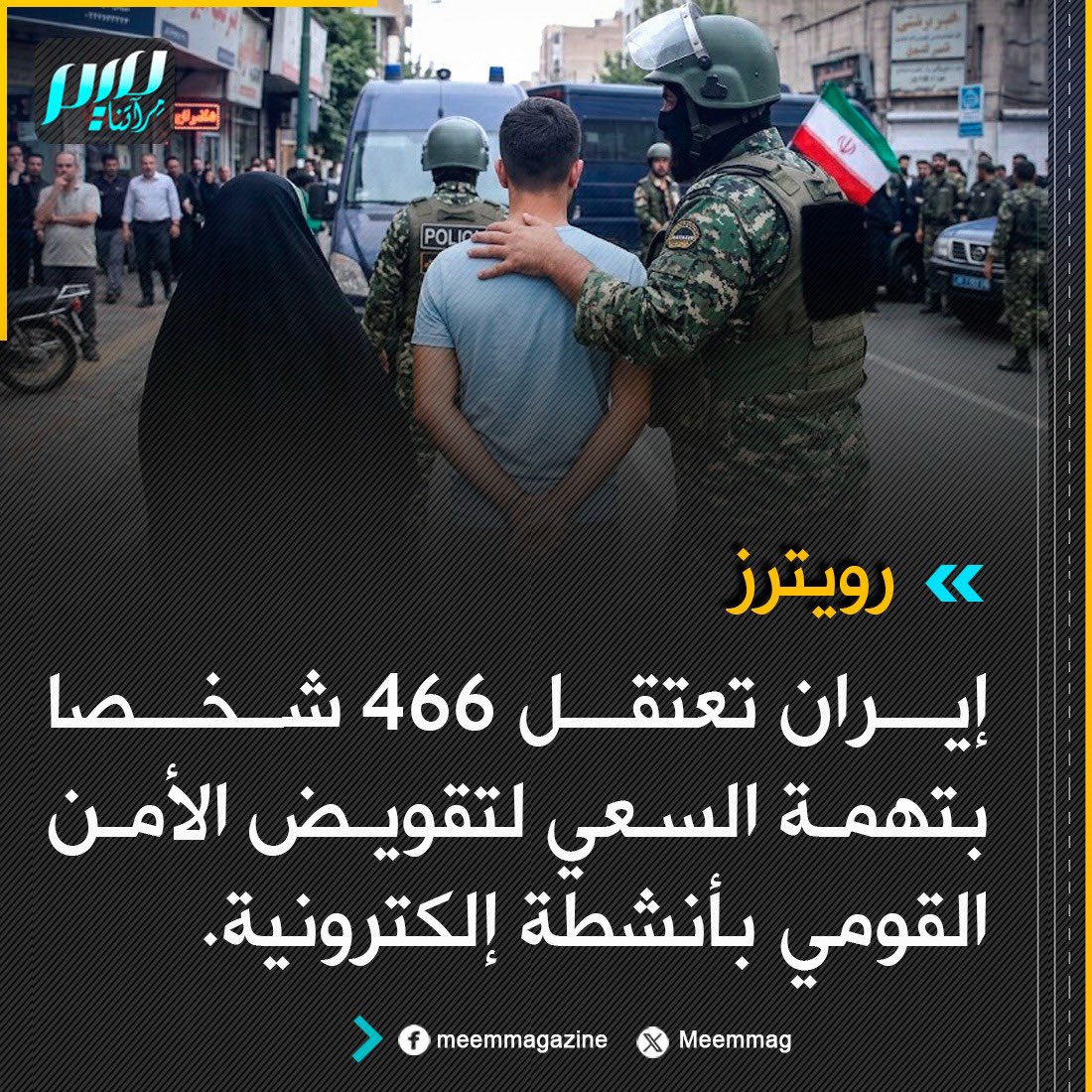 رويترز: إيران تعتقل 466 شخصا بتهمة السعي لتقويض الأمن القومي بأنشطة إلكترونية.