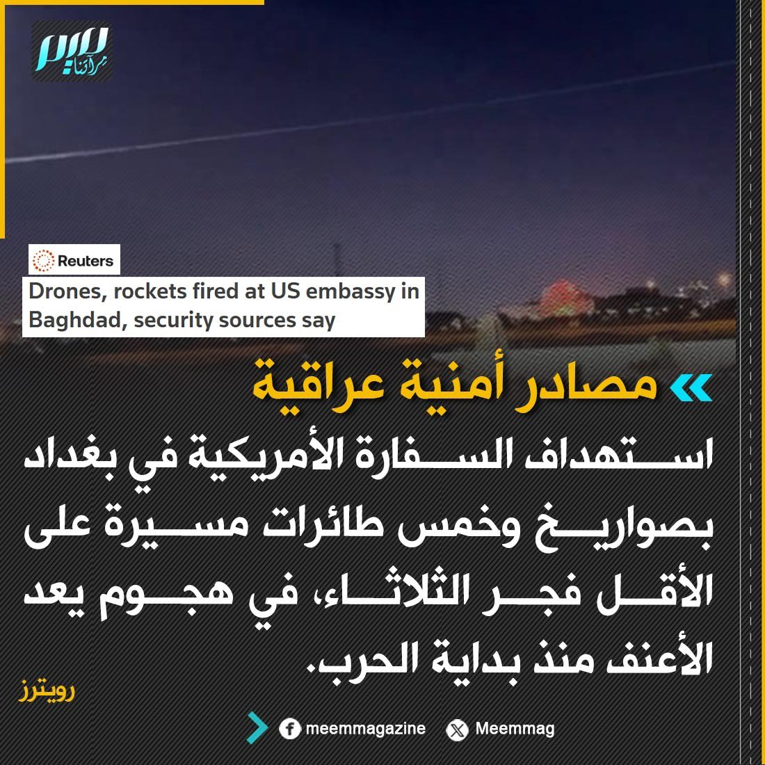 رويترز عن مصادر أمنية عراقية: استهداف السفارة الأمريكية في بغداد بصواريخ وخمس طائرات مسيرة على الأقل فجر الثلاثاء، في هجوم يعد الأعنف منذ بداية الحرب.