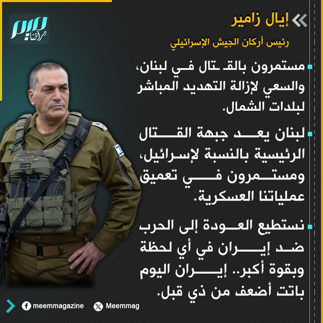 زامير: لبنان يعد جبهة القتال الرئيسية بالنسبة لإسرائيل