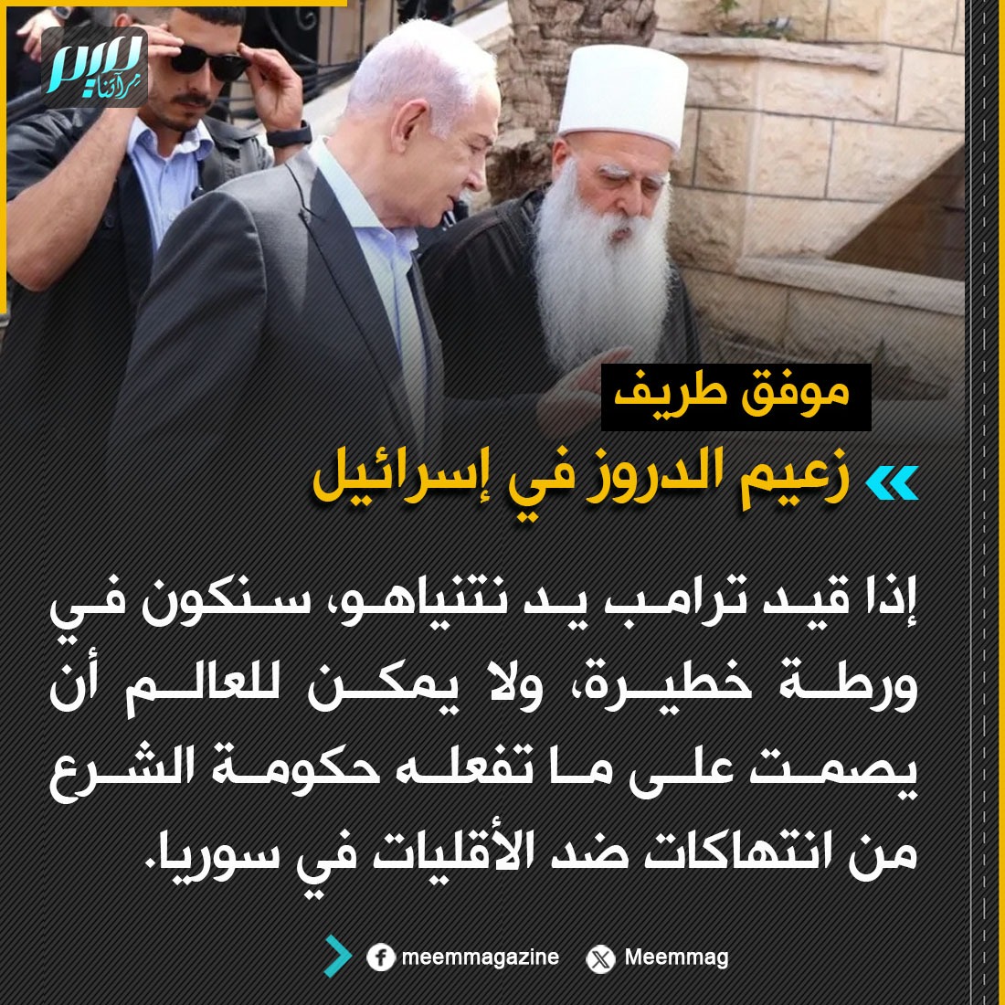 زعيم الدروز في إسرائيل: إذا قيد ترامب يد نتنياهو، سنكون في ورطة خطيرة، ولا يمكن للعالم أن يصمت على ما تفعله حكومة الشرع من انتهاكات ضد الأقليات في سوريا.
