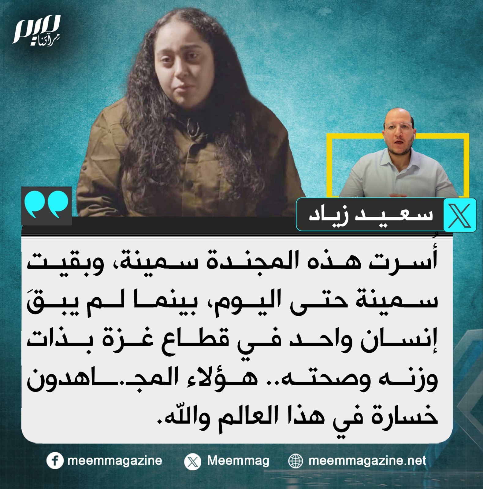 زياد: أُسرت هذه المجندة سمينة، وبقيت سمينة حتى اليوم، بينما لم يبقَ إنسان واحد في قطاع غزة بذات وزنه وصحته.. هؤلاء المجـ.ـاهدون خسارة في هذا العالم والله.