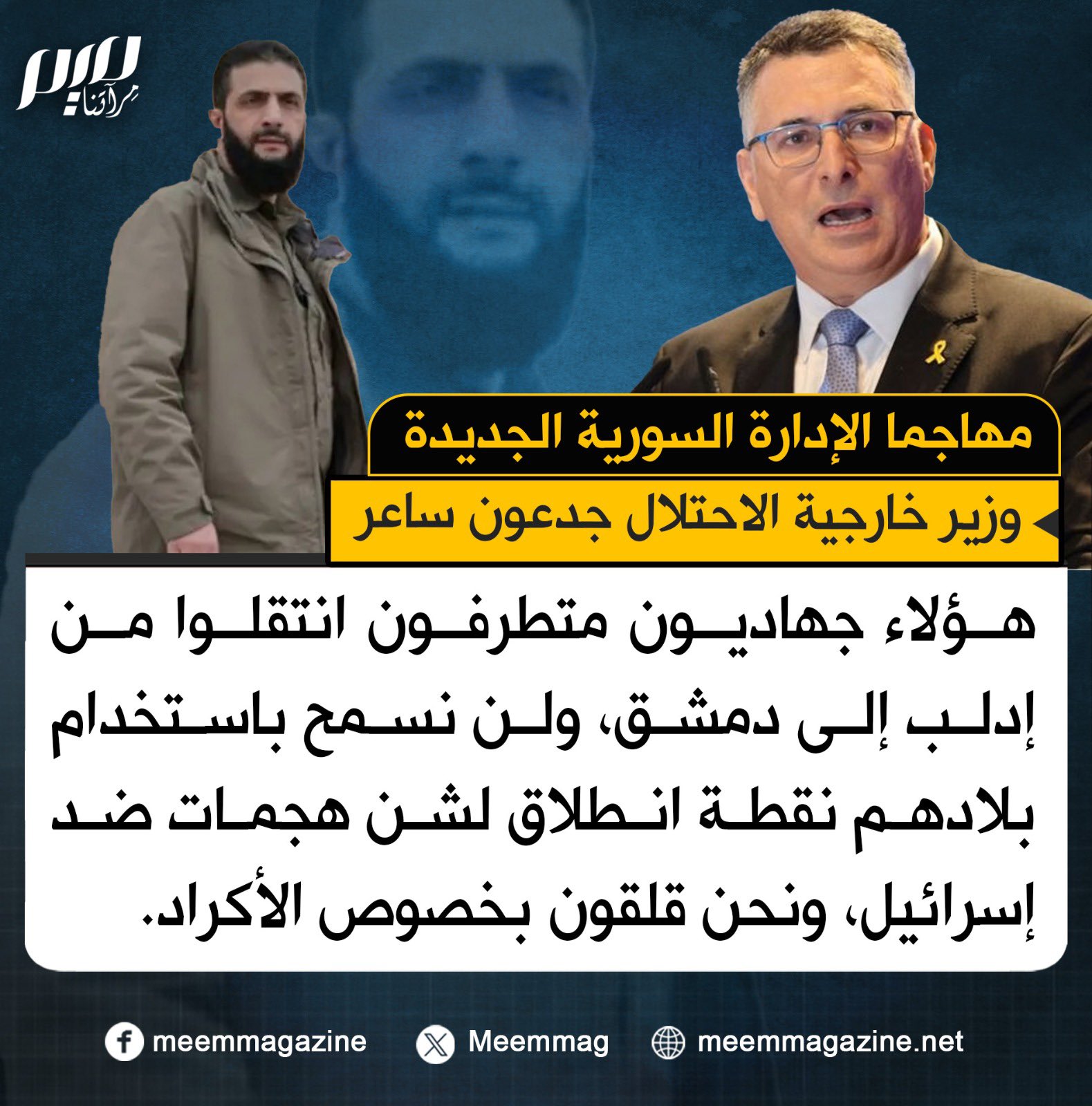 مهاجما الإدارة السورية الجديدة.. ساعر: هؤلاء جهـ ـاديون متطرفون انتقلوا من إدلب إلى دمشق، ولن نسمح باستخدام بلادهم نقطة انطلاق لشن هجمات ضد إسرائيل، ونحن قلقون بخصوص الأكراد.
