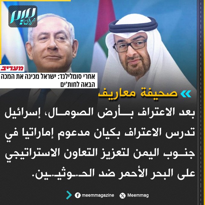 صحيفة معاريف: بعد الاعتراف بأرض الصومال، إسرائيل تدرس الاعتراف بكيان مدعوم إماراتيا في جنوب اليمن لتعزيز التعاون الاستراتيجي على البحر الأحمر ضد الحـ.ـوثيـ.ـين.