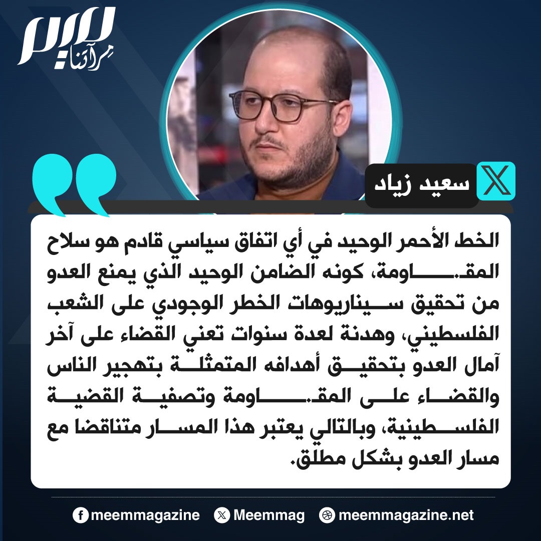 سعيد زياد: هدنة لعدة سنوات تعني القضاء على آخر آمال العدو بتحقيق أهدافه المتمثلة بتهجير الناس والقضاء على المقـ ـاومة وتصفية القضية الفلسطينية، وبالتالي يعتبر هذا المسار متناقضا مع مسار العدو بشكل مطلق.