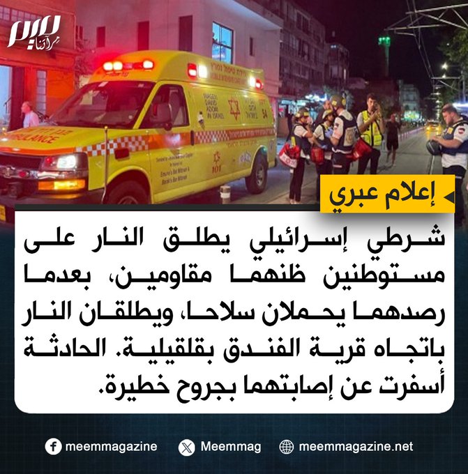 إعلام عبري: شرطي إسرائيلي يطلق النار على مستوطنين ظنهما مقاومين، بعدما رصدهما يحملان سلاحا، ويطلقان النار باتجاه قرية الفندق بقلقيلية. الحادثة أسفرت عن إصابتهما بجروح خطيرة.