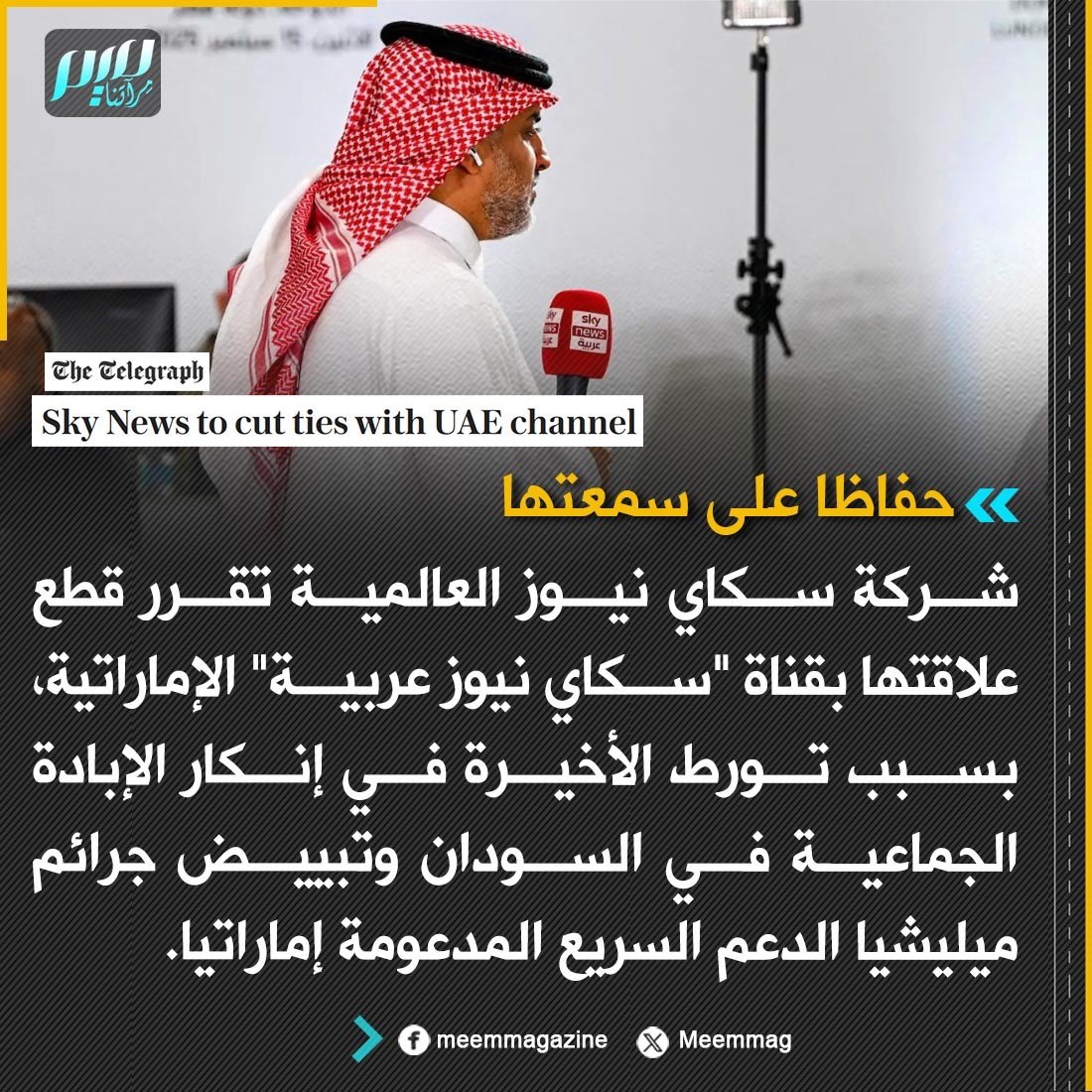 شركة سكاي نيوز العالمية تقرر قطع علاقتها بقناة "سكاي نيوز عربية" الإماراتية، بسبب تورط الأخيرة في إنكار الإبادة الجماعية في السودان وتبييض جرائم ميليشيا الدعم السريع المدعومة إماراتيا.