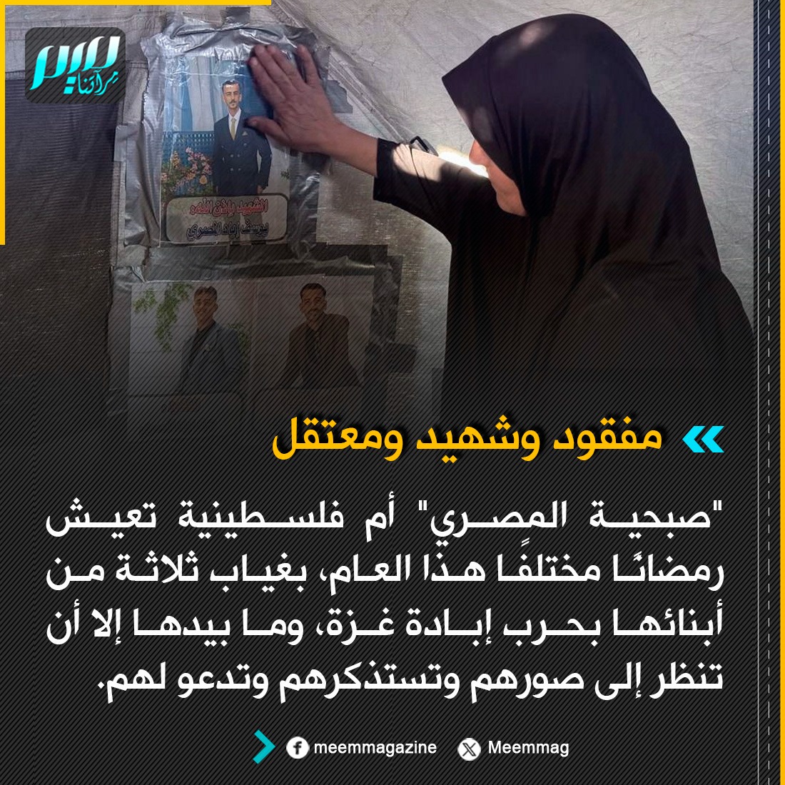 صبحية المصري" أم فلسطينية تعيش رمضانًا مختلفًا هذا العام، بغياب ثلاثة من أبنائها بحرب إبادة غزة، بين مفقود وشهيد ومعتقل، وما بيدها إلا أن تنظر إلى صورهم وتستذكرهم وتدعو لهم.