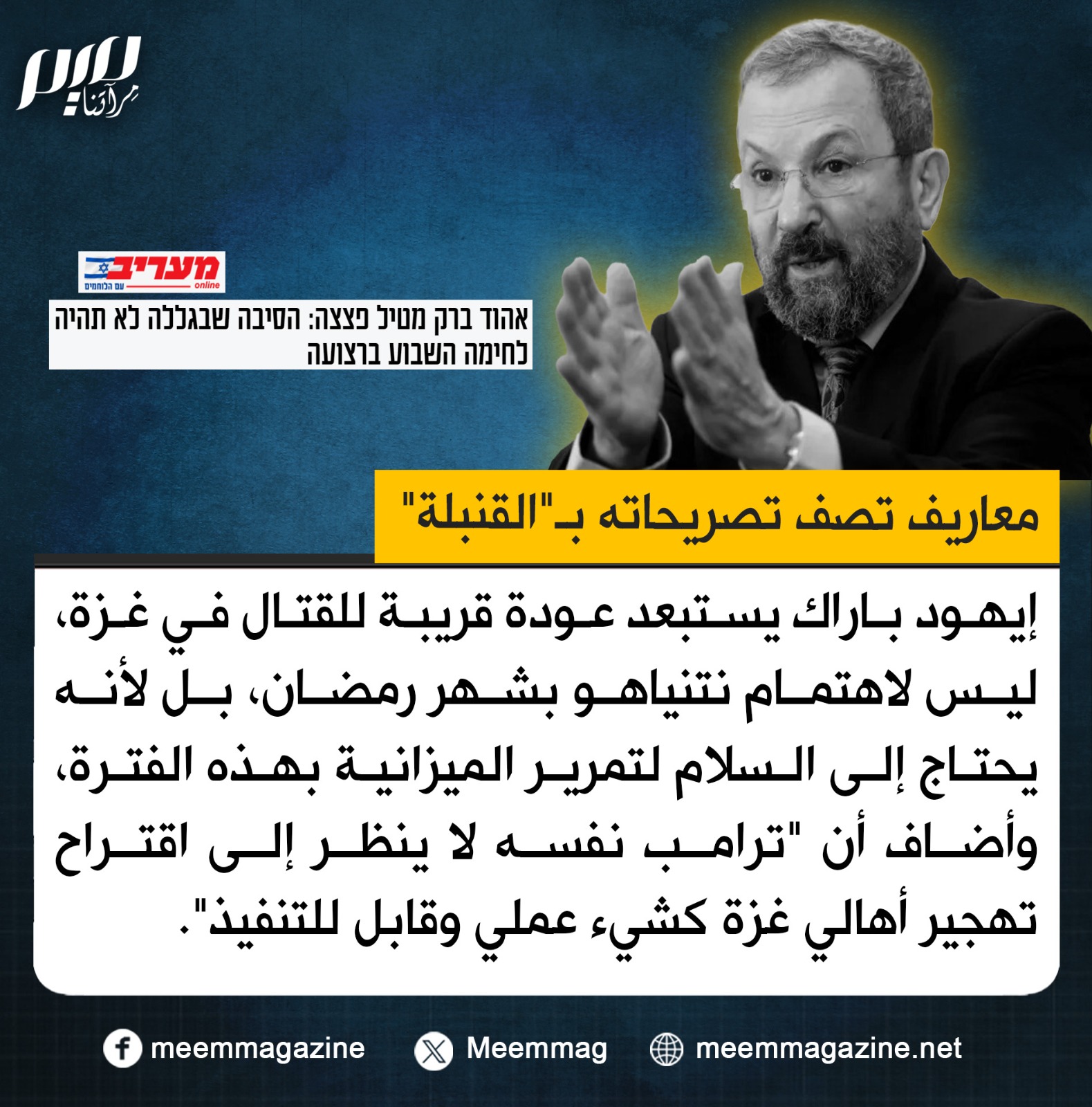 صحيفة "معاريف" العبرية تصف تصريحات رئيس وزراء الاحتلال وقائد الجيش الإسرائيلي الأسيبق بـ"القنبلة".