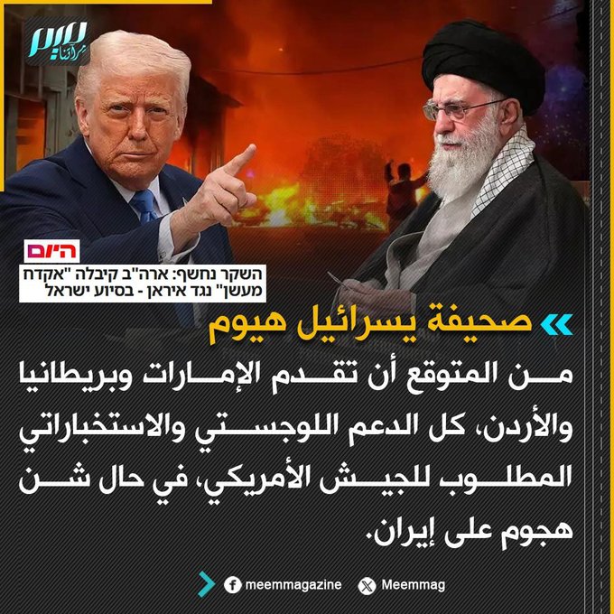 صحيفة يسرائيل هيوم: من المتوقع أن تقدم الإمارات وبريطانيا والأردن، كل الدعم اللوجستي والاستخباراتي المطلوب للجيش الأمريكي، في حال شن هجوم على إيران.