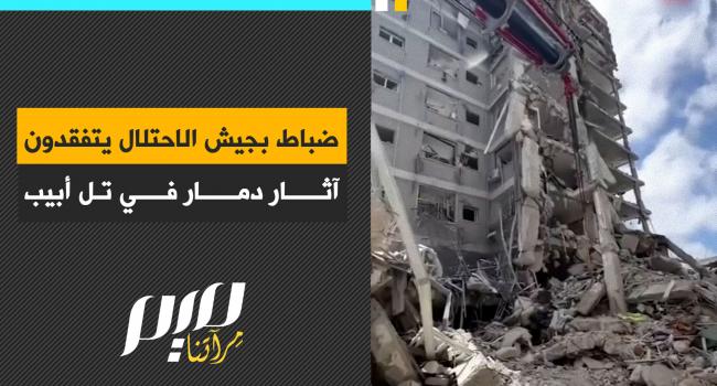 ضباط بجيش الاحتلال وفرق من الدفاع المدني يتفقدون آثار دمار في تل أبيب، جراء الصواريخ الإيرانية.