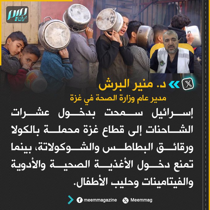 ضمن خطة خبيثة لهندسة المجاعة، يسمح الاحـ.ـتلال بدخول الكولا ورقائق البطاطس والشوكولاتة إلى قطاع غزة، بينما يمنع دخول الأغذية الصحية والأدوية والفيتامينات وحليب الأطفال!