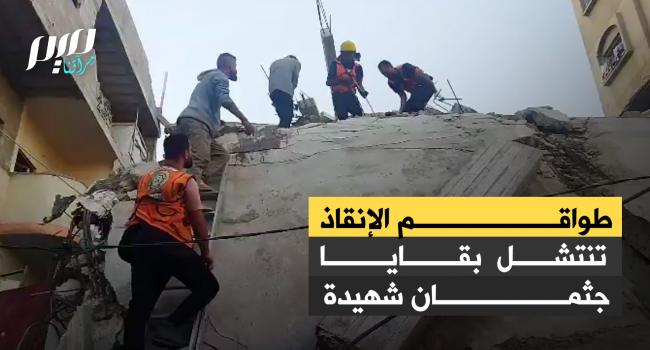 طواقم الإنقاذ في محافظة الوسطى بغزة، تتمكن من انتشال بقايا جثمان شهيدة، إثر استهداف إسرائيلي طال منزل عائلة أبو أمونة عصر اليوم.