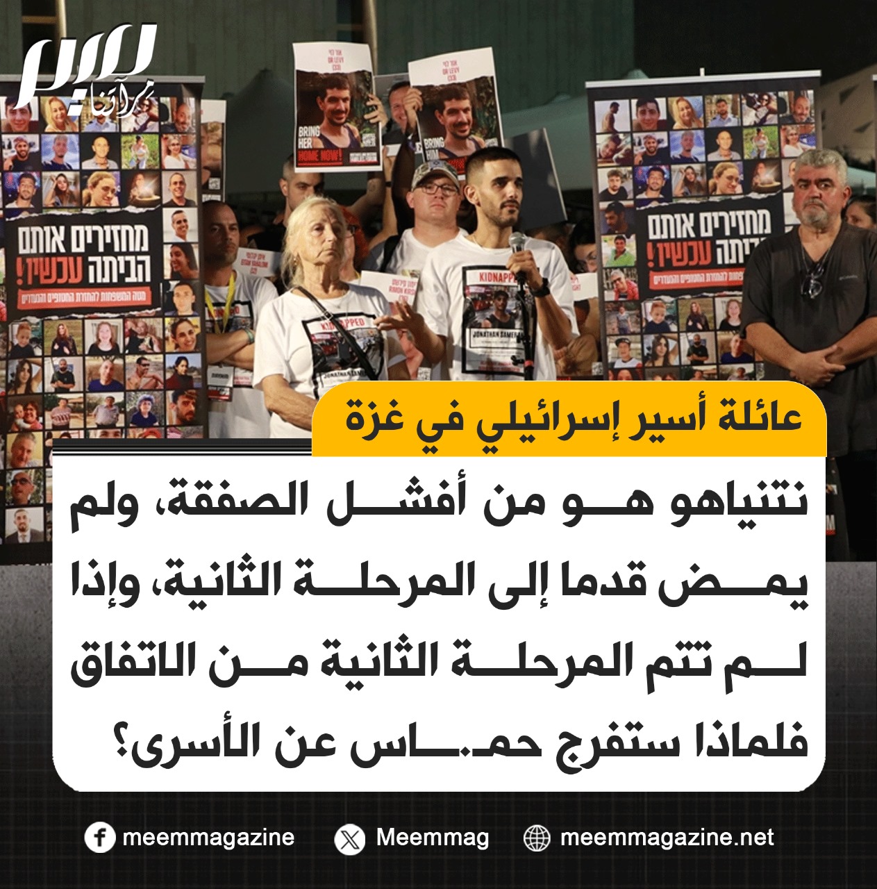 عائلة أسير إسرائيلي في غزة: نتنياهو هو من أفشل الصفقة، ولم يمض قدما إلى المرحلة الثانية، وإذا لم تتم المرحلة الثانية من الاتفاق فلماذا ستفرج حمـ.ـــاس عن الأسرى؟