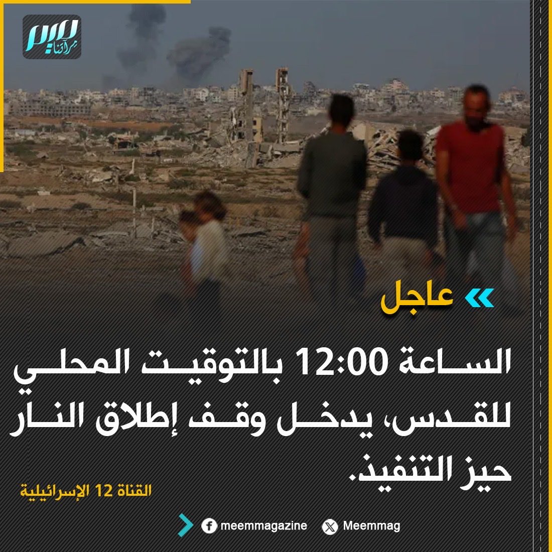 عاجل: الساعة 12:00 بالتوقيت المحلي للقدس، يدخل وقف إطلاق النار حيز التنفيذ، بحسب بيان رسمي نقلته القناة 12 الإسرائيلية عن حكومة نتنياهو.