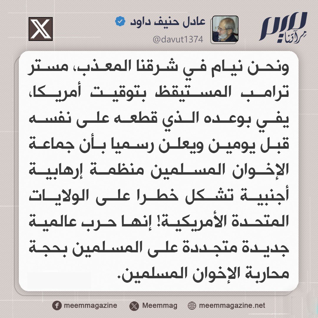 عادل داود: إنها حرب عالمية جديدة متجددة على المسلمين بحجة محاربة الإخوان المسلمين.