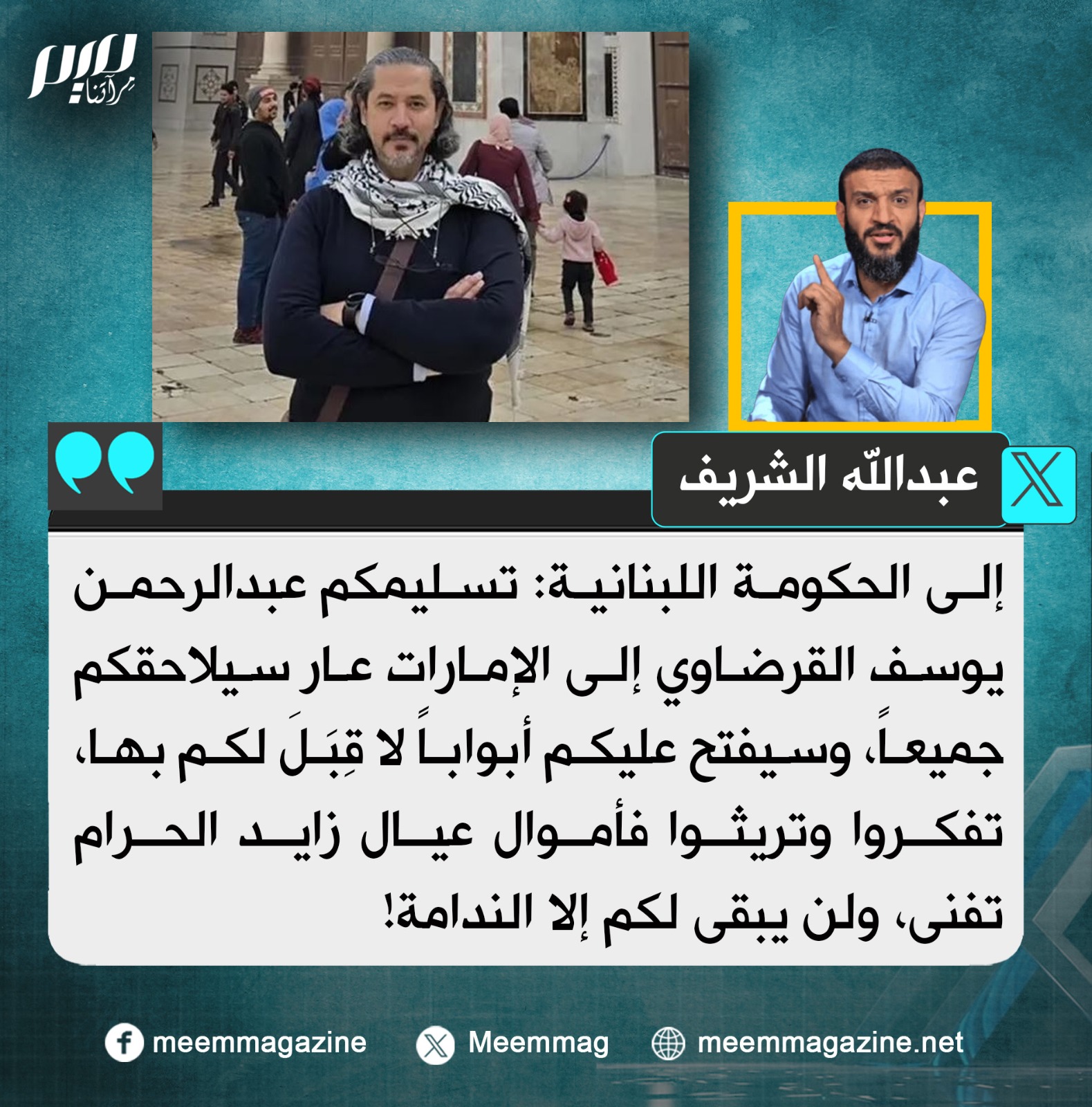 عبدالله الشريف: إلى الحكومة اللبنانية: تسليمكم عبدالرحمن يوسف القرضاوي إلى الإمارات عار سيلاحقكم جميعاً، وسيفتح عليكم أبواباً لا قِبَلَ لكم بها، تفكروا وتريثوا فأموال عيال زايد الحرام تفنى، ولن يبقى لكم إلا الندامة!