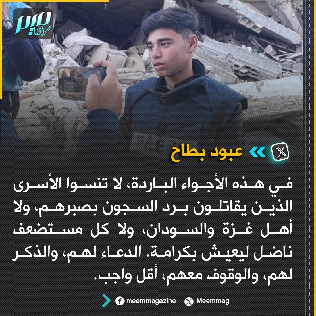 عبود بطاح: في هذه الأجواء الباردة، لا تنسوا الأسرى الذين يقاتلون برد السجون بصبرهم، ولا أهل غزة والسودان، ولا كل مستضعف ناضل ليعيش بكرامة. الدعاء لهم، والذكر لهم، والوقوف معهم، أقل واجب.