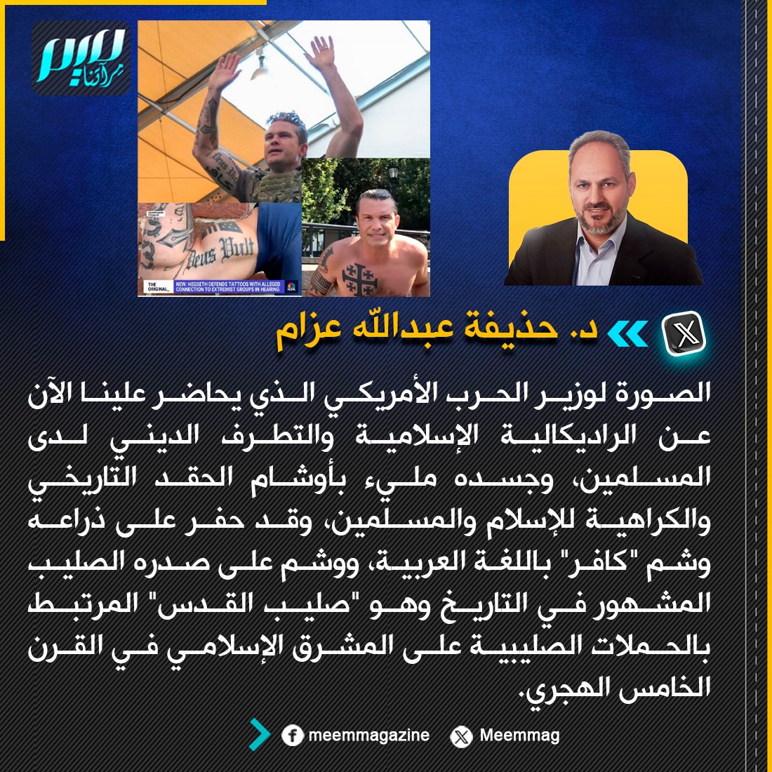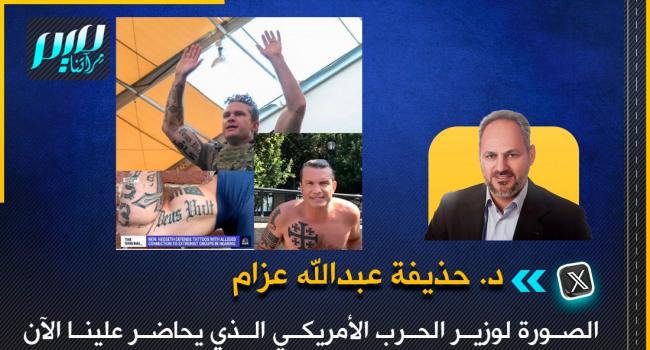 عزام: الصورة لوزير الحرب الأمريكي الذي يحاضر علينا الآن عن الراديكالية الإسلامية والتطرف الديني لدى المسلمين، وجسده مليء بأوشام الحقد التاريخي والكراهية للإسلام والمسلمين، وقد حفر على ذراعه وشم "كافر" باللغة العربية، ووشم على صدره الصليب المشهور في التاريخ وهو "صليب القدس" المرتبط بالحملات الصليبية على المشرق الإسلامي في القرن الخامس الهجري.