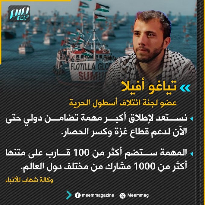 عضو لجنة ائتلاف أسطول الحرية تياغو أفيلا: نستعد لإطلاق أكبر مهمة تضامن دولي حتى الآن لدعم قطاع غزة وكسر الحصار.