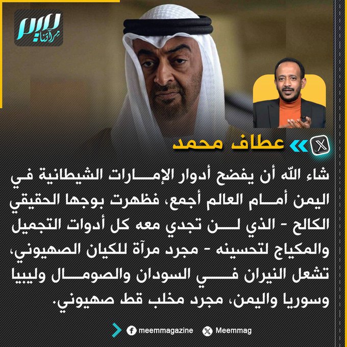 عطاف محمد: شاء الله أن يفضح أدوار الإمارات الشيطانية في اليمن أمام العالم أجمع، فظهرت بوجها الحقيقي الكالح مجرد مرآة للكيان الصهيوني، تشعل النيران في السودان والصومال وليبيا وسوريا واليمن، مجرد مخلب قط صهيوني.