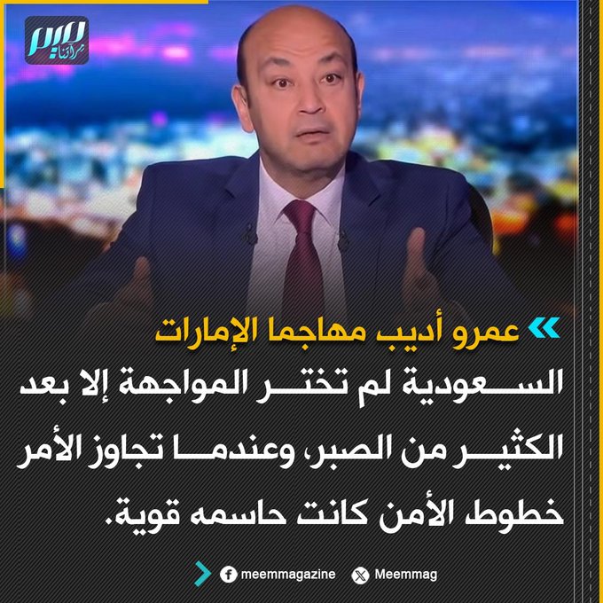 عمرو أديب مهاجما الإمارات: السعودية لم تختر المواجهة إلا بعد الكثير من الصبر، وعندما تجاوز الأمر خطوط الأمن كانت حاسمه قوية.