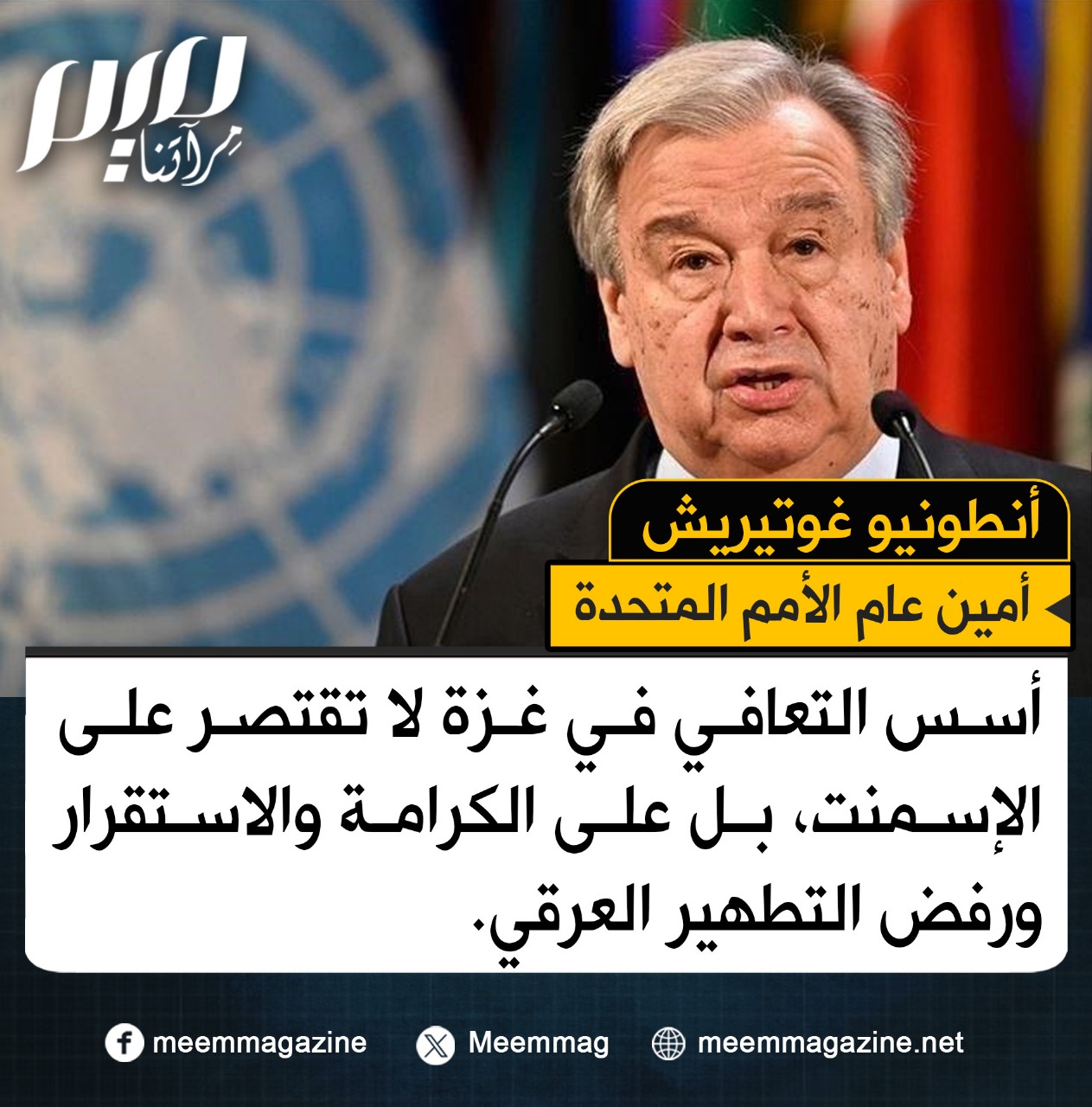 غوتيريش: أسس التعافي في غزة لا تقتصر على الإسمنت، بل على الكرامة والاستقرار ورفض التطهير العرقي.