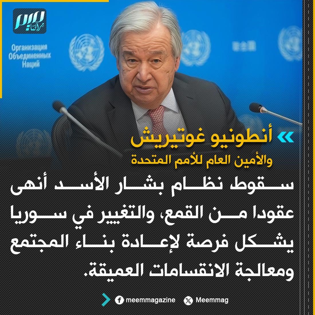 غوتيريش: سقوط نظام بشار الأسد أنهى عقودا من القمع، والتغيير في سوريا يشكل فرصة لإعادة بناء المجتمع ومعالجة الانقسامات العميقة.
