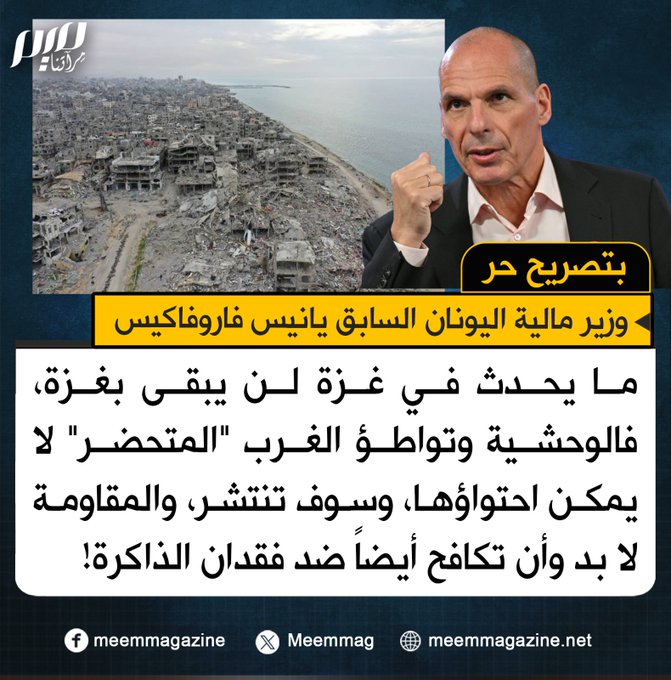 بتصريح حر.. فاروفاكيس: ما يحدث في غزة لن يبقى بغزة، فالوحشية وتواطؤ الغرب "المتحضر" لا يمكن احتواؤها، وسوف تنتشر، والمقاومة لا بد وأن تكافح أيضاً ضد فقدان الذاكرة!