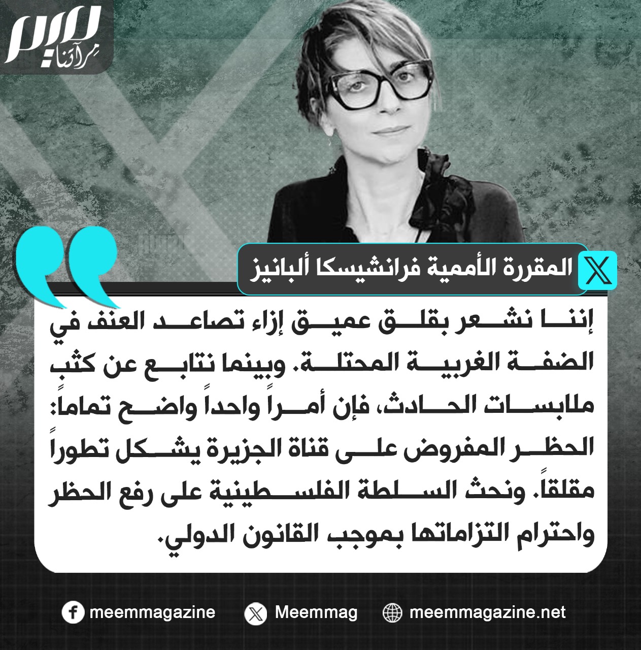 فرانشيسكا ألبانيز: الحظر المفروض على قناة الجزيرة يشكل تطوراً مقلقاً. ونحث السلطة الفلسطينية على رفع الحظر واحترام التزاماتها بموجب القانون الدولي.