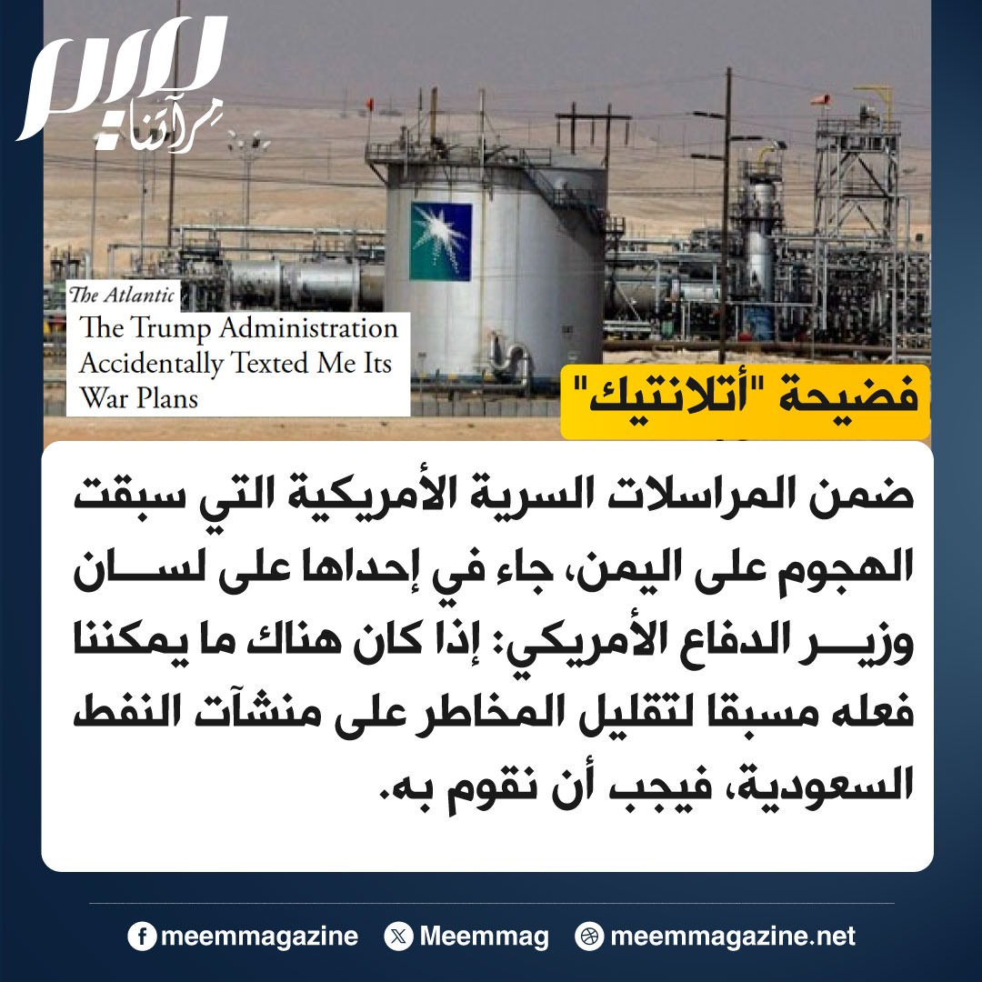 فضيحة "أتلانتيك".. ضمن المراسلات السرية الأمريكية التي سبقت الهجوم على اليمن، جاء في إحداها على لسان وزير الدفاع الأمريكي: إذا كان هناك ما يمكننا فعله مسبقا لتقليل المخاطر على منشآت النفط السعودية، فيجب أن نقوم به.