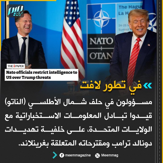 في تطور لافت: مسؤولون في حلف شمال الأطلسي (الناتو) قيدوا تبادل المعلومات الاستخباراتية مع الولايات المتحدة، على خلفية تهديدات دونالد ترامب ومقترحاته المتعلقة بغرينلاند.