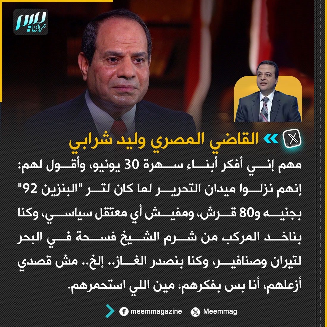 قاض مصري: مهم إني أفكر أبناء سهرة ٣٠ يونيو، وأقول لهم: إنهم نزلوا ميدان التحرير لما كان لتر "البنزين 92" بجنيه و٨٠ قرش، ومفيش أي معتقل سياسي، وكنا بناخد المركب من شرم الشيخ فسحة في البحر لتيران وصنافير، وكنا بنصدر الغاز.. إلخ.. مش قصدي أزعلهم، أنا بس بفكرهم، مين اللي استحمرهم.