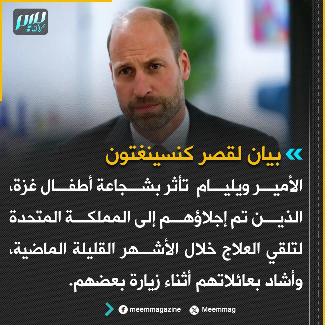 قصر كنسينغتون: الأمير ويليام تأثر بشجاعة أطفال غزة، الذين تم إجلاؤهم إلى المملكة المتحدة لتلقي العلاج خلال الأشهر القليلة الماضية، وأشاد بعائلاتهم أثناء زيارة بعضهم.