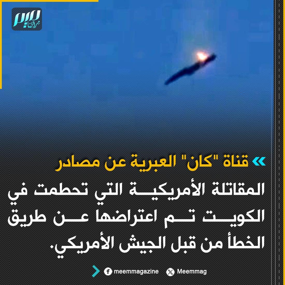 قناة "كان" العبرية عن مصادر: المقاتلة الأمريكية التي تحطمت في الكويت تم اعتراضها عن طريق الخطأ من قبل الجيش الأمريكي.