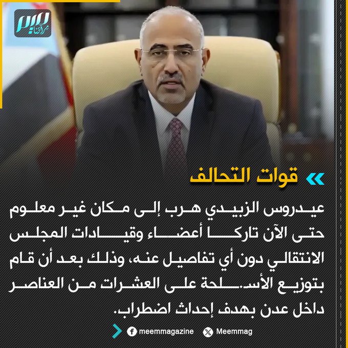قوات التحالف: عيدروس الزبيدي هرب إلى مكان غير معلوم حتى الآن تاركا أعضاء وقيادات المجلس الانتقالي دون أي تفاصيل عنه، وذلك بعد أن قام بتوزيع الأسـ.ــلحة على العشرات من العناصر داخل عدن بهدف إحداث اضطراب.