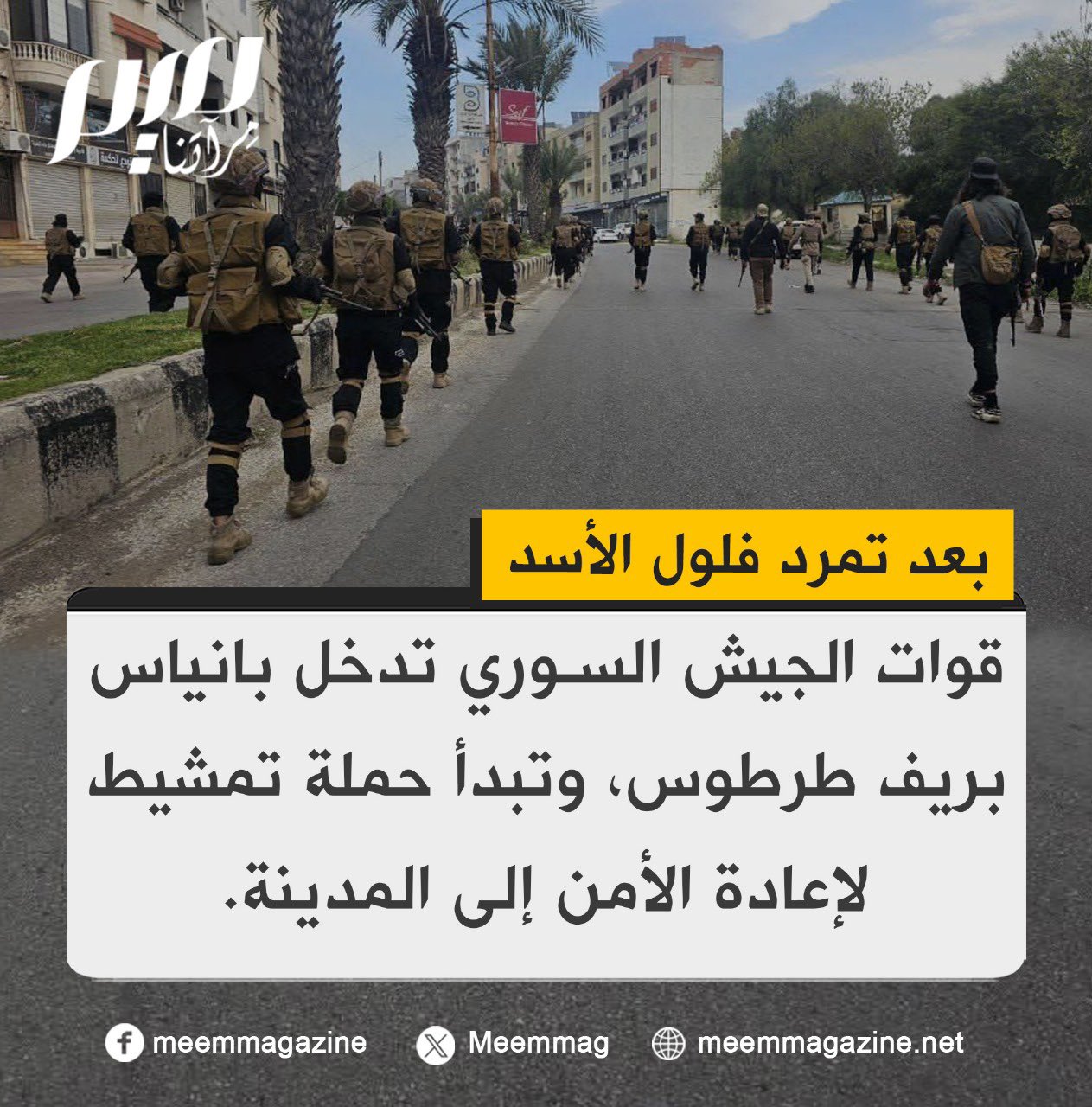 قوات الجيش السوري تدخل بانياس بريف طرطوس، وتبدأ حملة تمشيط لإعادة الأمن إلى المدينة.
