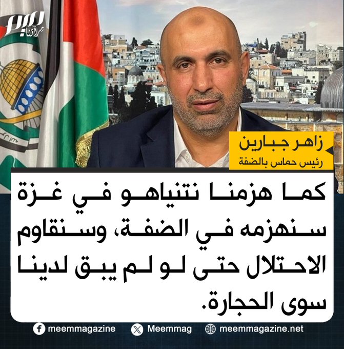 قيادي حماس زاهر جبارين: كما هزمنا نتنياهو في غزة سنهزمه في الضفة، وسنقاوم الاحتلال حتى لو لم يبق لدينا سوى الحجارة.