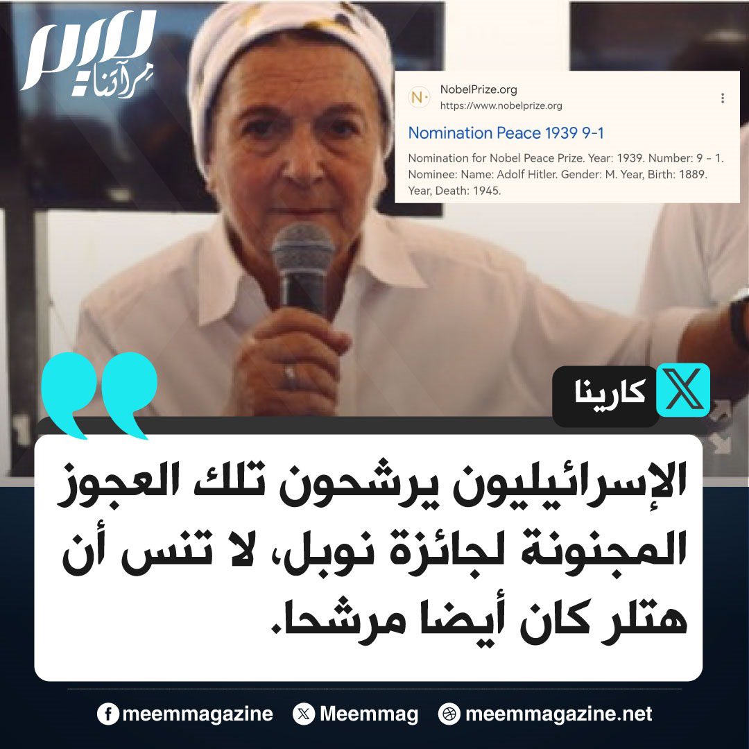 كارينا: الإسرائيليون يرشحون تلك العجوز المجنونة لجائزة نوبل، لا تنس أن هتـ ـلر كان أيضا مرشحا.