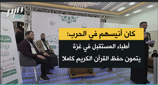 "كان أنيسنا في الحرب والنور الذي لم ينقطع".. 155 طالبا وطالبة من كليات الطب في جامعات قطاع غزة يتمون حفظ القرآن الكريم كاملاً، تحت إشراف دار الإتقان لتحفيظ القرآن الكريم وضمن فوج بعنوان "فوج الأطباء.. نور وشفاء".