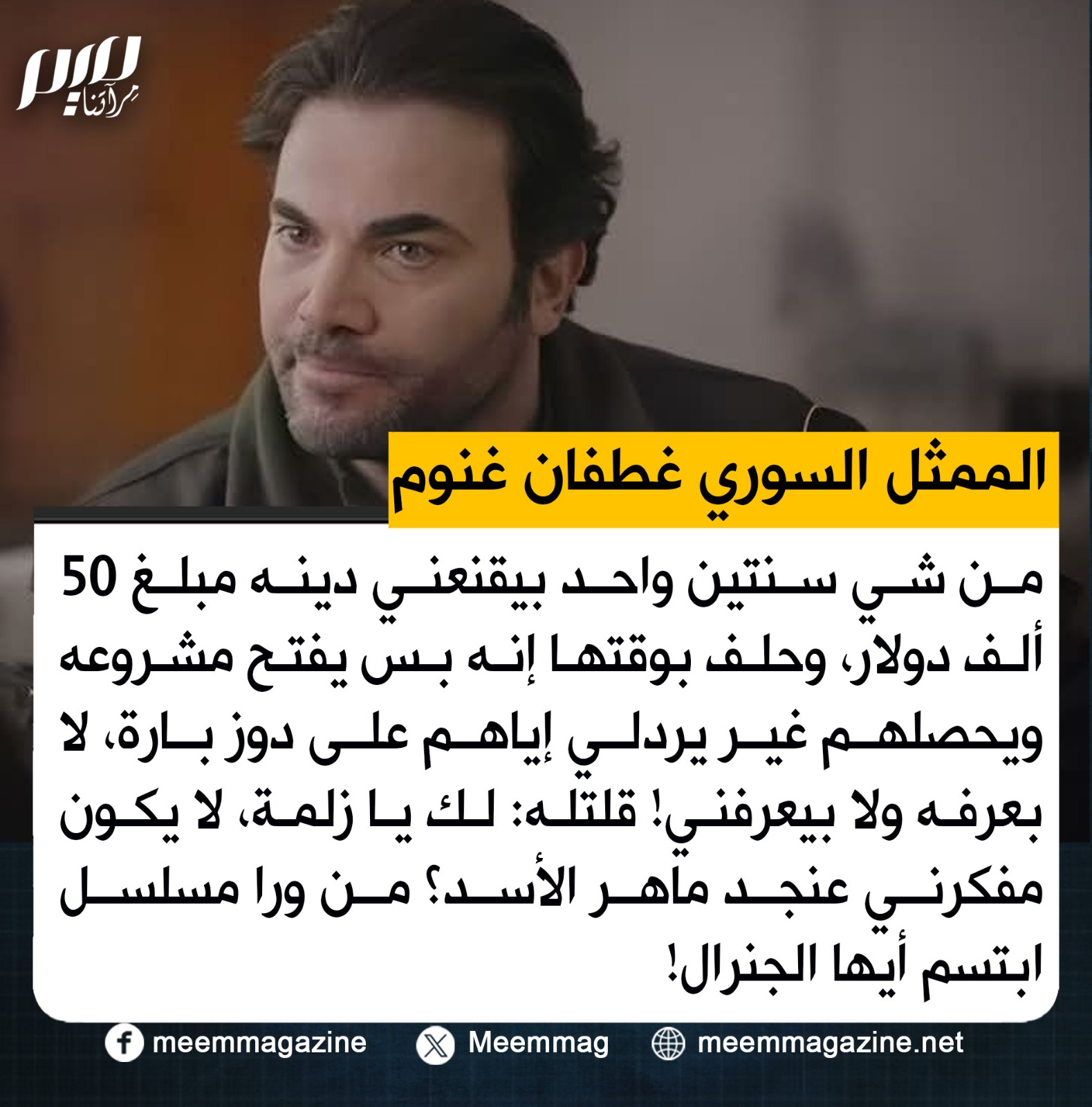 الممثل السوري غطفان غنوم: من شي سنتين واحد بيقنعني دينه مبلغ ٥٠ ألف دولار، وحلف بوقتها إنه بس يفتح مشروعه ويحصلهم غير يردلي إياهم على دوز بارة، لا بعرفه ولا بيعرفني! قلتله: لك يا زلمة، لا يكون مفكرني عنجد ماهر الأسد؟ من ورا مسلسل ابتسم أيها الجنرال!