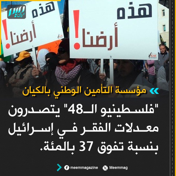 مؤسسة التأمين الوطني بالكيان: "فلسطينيو الـ48" يتصدرون معدلات الفقر في إسرائيل بنسبة تفوق 37 بالمئة.