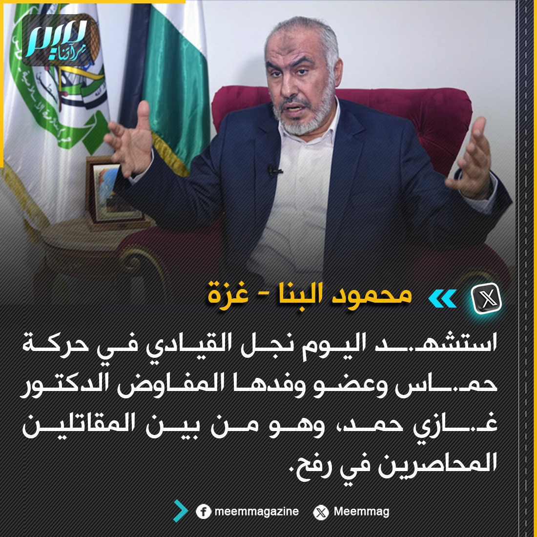 محمود البنا: استشهـ.ـد اليوم نجل القيادي في حركة حمـ.ـاس وعضو وفدها المفاوض الدكتور غـ.ـازي حمد، وهو من بين المقـ.ـاتلين المحاصرين في رفح جنوب غزة.
