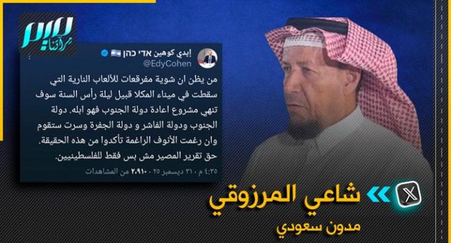 مدون سعودي: هل عرفتم السبب الآن؟ هذا "إيدي كوهين" وكيانه هم أسباب رفض الانتقالي لتعليمات التحالف، والباقي أنتم تفهمونه -وما ودنا نكثر الشرح- ولكن الله يهدي من لا زال يعتقد أن السبب من التحالف، والسبب هو محاولة الانتقام من المملكة وبأيادي شقيقة.