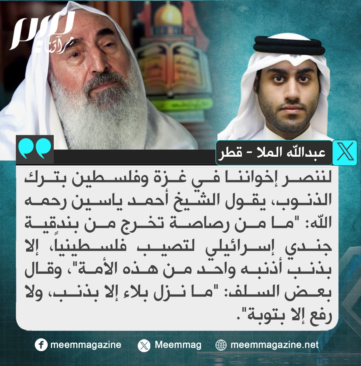 مدون قطري: لننصر إخواننا في غزة وفلسطين بترك الذنوب، يقول الشيخ أحمد ياسين رحمه الله: "ما من رصاصة تخرج من بندقية جندي إسرائيلي لتصيب فلسطينياً، إلا بذنب أذنبه واحد من هذه الأمة"، وقال بعض السلف: "ما نزل بلاء إلا بذنب، ولا رفع إلا بتوبة".