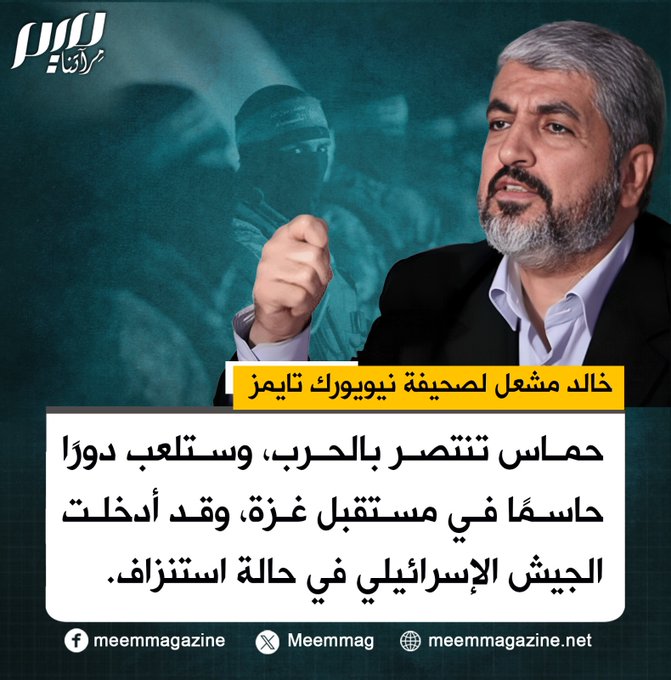 مشـ ـعل: حمـ ـاس تنتصر بالحرب، وستلعب دورًا حاسمًا في مستقبل غزة، وقد أدخلت الجيش الإسرائيلي في حالة استنزاف.